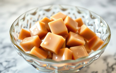 A plate of homemade caramel candies topped with nuts, ready to be enjoyed