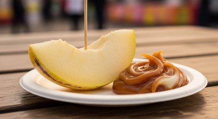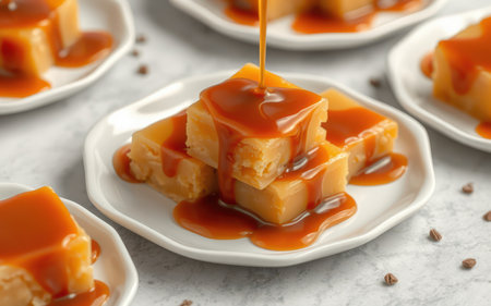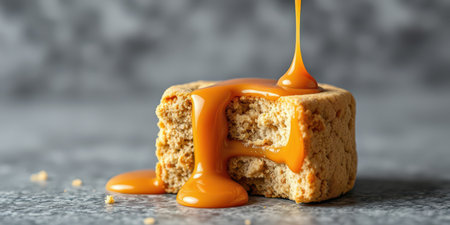 Delicious dessert with caramel sauce drizzled on a piece of sweet treat set against a textured backdrop