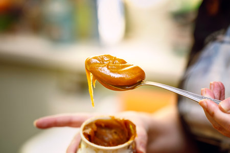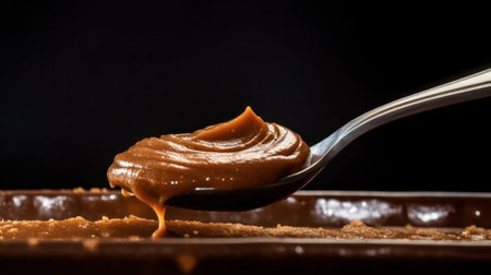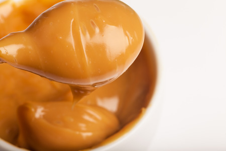 Dulce de leche in a spoon, very sweet creme caramel or praline creme from Argentina, made of milk boiled with sugar for hours.