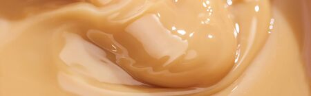 A close-up shot of a caramel swirl with a creamy texture creating a dynamic and abstract motion. The image features flowing liquid with a blend of brown and white colors.