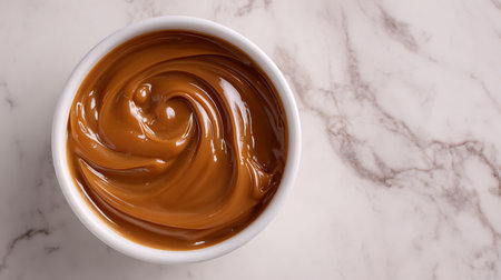 Overhead shot showcases creamy dulce de leche swirls in a white ceramic bowl, contrasted by a light marble background. The smooth texture and inviting color highlight sweetness.
