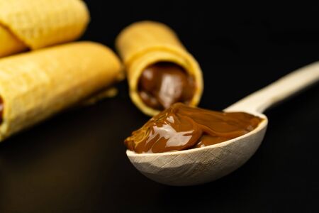 Wafer rolls with condensed milk and a wooden spoon on a black background