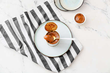 Homemade salted caramel with a spoon and napkin on the table. Delicious dessert
