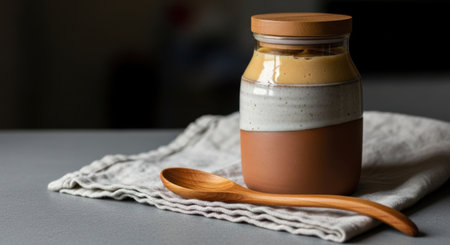 A rustic ceramic jar with a wooden lid sits beside a wooden spoon on a textured cloth.