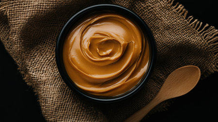 A richly textured vegan protein spread swirls in a black bowl, resting on rustic burlap fabric. This eco-friendly delight invites culinary experimentation and healthy eating.