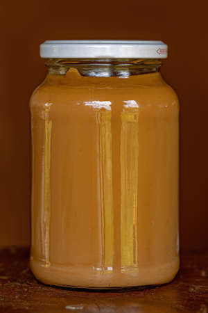 Peanut butter or caramel sauce in glass jar on isolated beige background with spoon and shadow. Concept of tasty and healthy snack for breakfast. Free space for text.