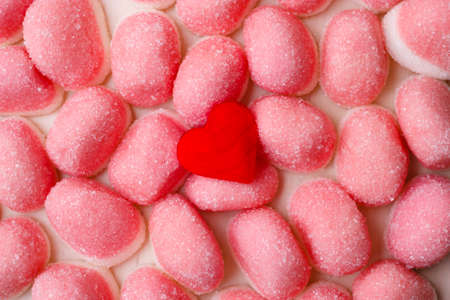 Sweet food candy background. Pink jellies or marshmallows wallpaper decorated with red heart love symbol