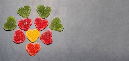Banner. Marmalade multi-colored sweets in the shape of a heart are laid out in the shape of a flower. Marmalade in sugar on a chalk board background. Save space, sweets.
