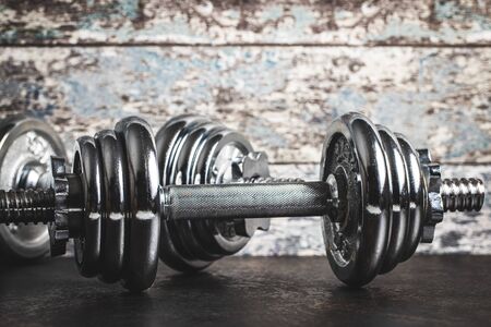 Close up of dumbbells on grey backgound. Sport and fitness equipment. Horizontal sport poster, greeting cards, headers, website.