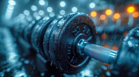 A sleek black dumbbell rests on a glossy surface, surrounded by soft elegant lights. Ideal for fitness themes, this image captures the essence of training and motivation.