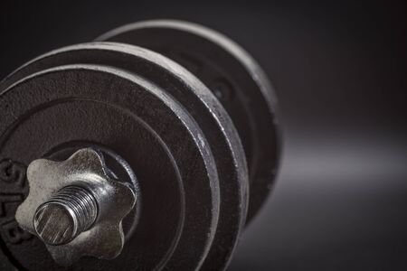 iClose up of dumbbells on grey backgound. Sport and fitness equipment. Horizontal sport poster, greeting cards, headers, website.