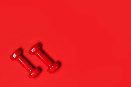 Top view of red dumbbells on red background.