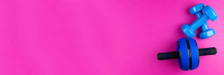 Sports kit: dumbbells, roller for press on a pink background, photo banner, top view, space for text.