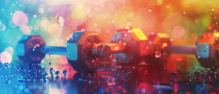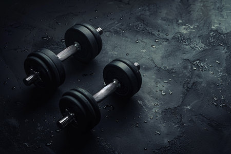 Glossy Steel Dumb bells set on brown table with water drop background
