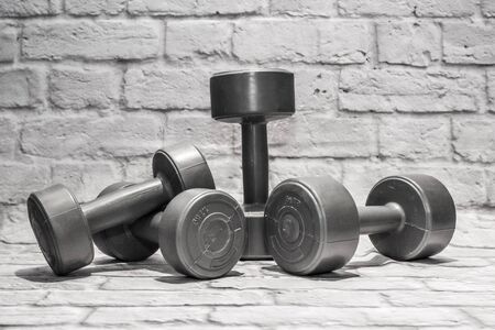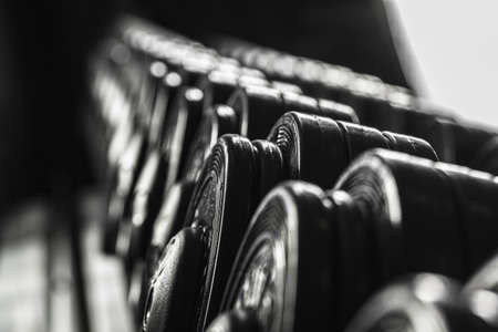 Black color dumbbell weights in fitness center. Gym equipment. Blurred background for copy space. Shallow depth.