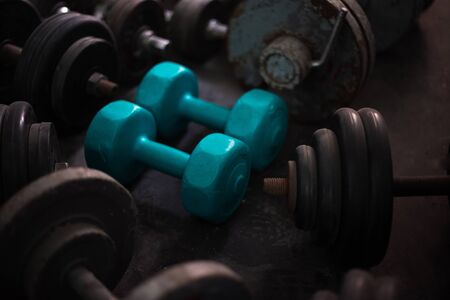 Fitness or bodybuilding background of old iron dumbbells on grey, conrete floor in the gym