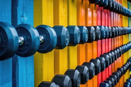 A close up of a row of dumbbells sitting on top of each other, AI