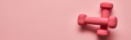 top view of pink dumbbells on pink background with copy space, panoramic shot