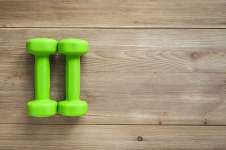 Green dumbbells on a wooden background. The concept of a healthy lifestyle, fitness, yoga.