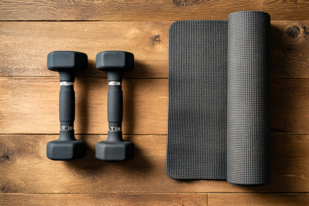 A cozy home gym setup featuring colorful mats and sleek weights arranged on warm wooden flooring, ready to inspire fitness routines and relaxation sessions.