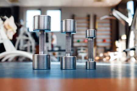 Sports equipment in gym. Dumbbells of different weight close up