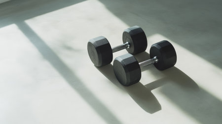 Two black dumbbells lie on a light gray floor, casting long shadows in the bright sunlight streaming through a nearby window, creating a serene and motivational fitness scene