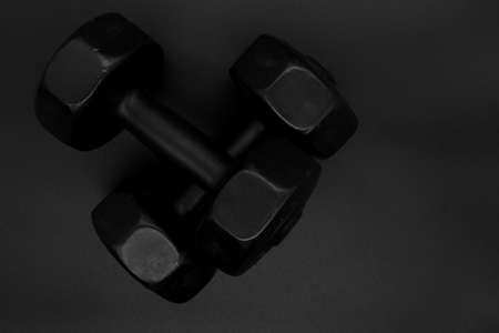 Dumbbells on black background. Fitness, sport and workout concept flat lay. Weights layout with copy space