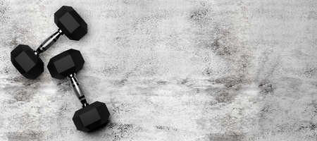 Two fitness gym hexbells or dumbbells with chrome handle and black weights over concrete floor background flat lay top view from above, muscle exercise, bodybuilding or fitness concept, 3D illustration