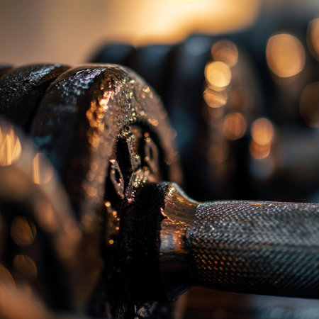 Close-up view of various weights stacked on a dark surface, highlighting their texture and design in a fitness setting, perfect for workout inspiration.