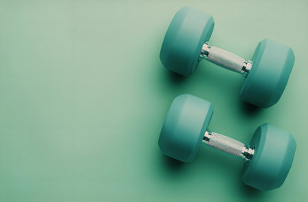 Minimalist flat lay photo of fitness dumbbells over turquoise blue