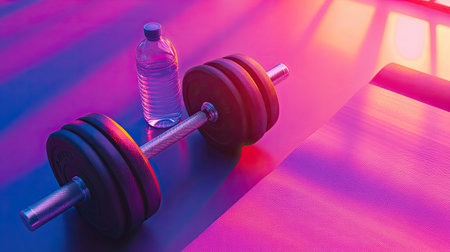 A vibrant scene featuring a dumbbell and a water bottle on a workout mat, perfect for promoting fitness and healthy lifestyle in a modern gym environment.