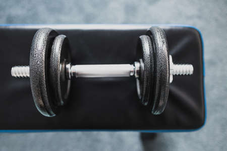 home gym and fit lifestyle still-life, room with flat abs bench and dummbell on top of it shot at shallow depth of field with desaturated moody tones