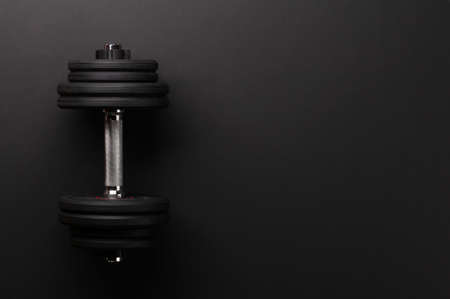 Dumbbells on black background. Fitness, sport and workout concept flat lay. Weights layout with copy space