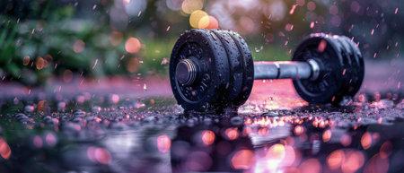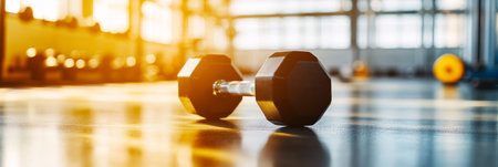 Black dumbbell rests on the gym floor at sunset, symbolizing strength training and a fit lifestyle. The warm light adds tranquility, highlighting power and determination in weightlifting