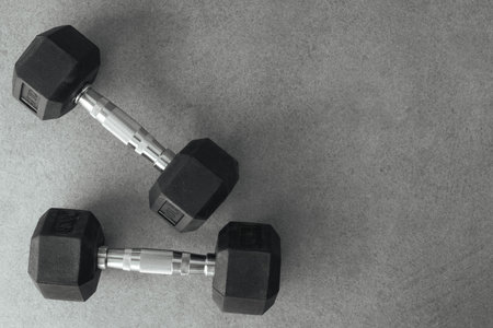 iClose up of dumbbells on grey backgound. Sport and fitness equipment. Horizontal sport poster, greeting cards, headers, website.