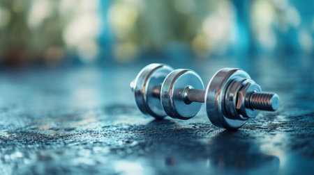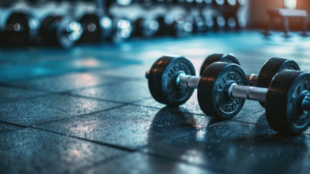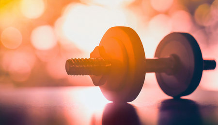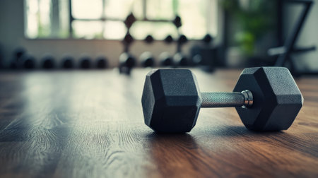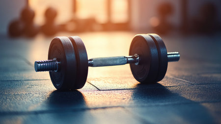 A close-up image of a dumbbell resting on a gym floor, illuminated by soft light, representing fitness, strength training, and a commitment to health.
