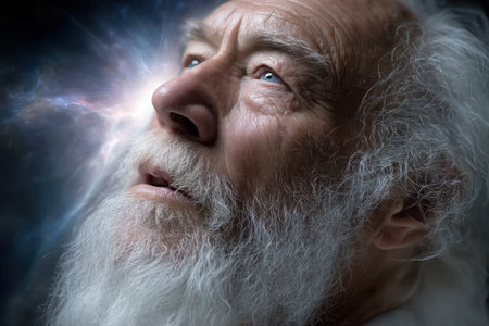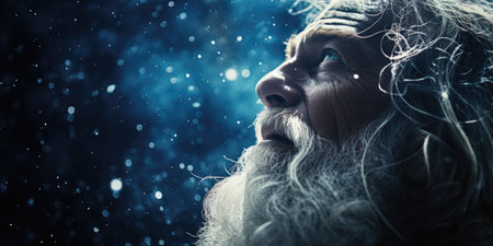 An elderly man with a long white beard gazes up, pondering the universe with a serene expression.