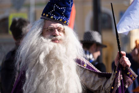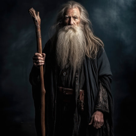 lifestyle photo old wizard standing with walking stick.