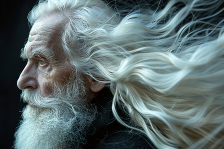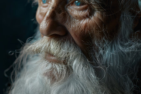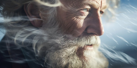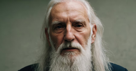 Close-up portrait of a contemplative senior man with a long white beard and hair, conveying a sense of wisdom and experience