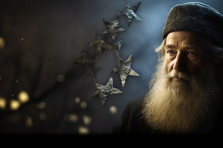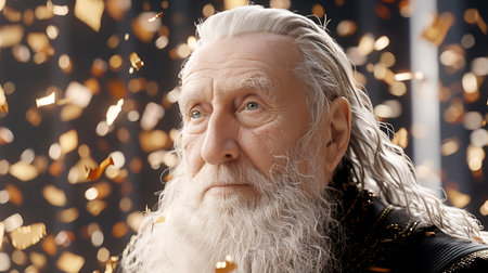Portrait of an old man with a white beard on a background of golden confetti