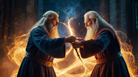 Two wizards, with long white hair and beards, face off in a magical duel, holding wands emitting bright sparks, surrounded by swirling flames and ethereal energies in a stone setting.