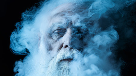 Close-up portrait of an old man with white beard shrouded in a haze of swirling blue vapors.