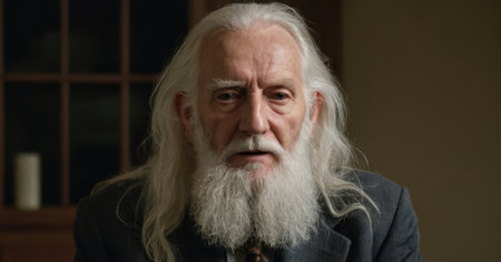 Portrait of an elderly professor with long white hair and beard, conveying wisdom and experience