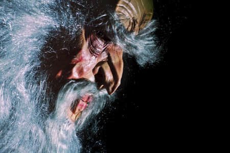Man Hair blowing in the air, long white or grey hair, old man. Isolated on black.