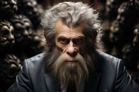 An old prehistoric man with a beard and a suit, AI