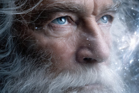 An elderly man gazes thoughtfully, his piercing blue eyes contrasting with his weathered skin and white beard. The soft light enhances the details of his face and expressions.