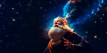 An elder with a long white beard gazes thoughtfully, surrounded by swirling celestial patterns and stars.