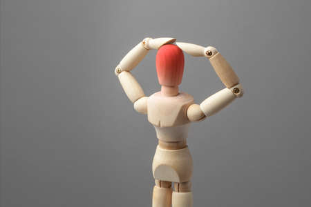 Headache concept. Wooden man holds his hands over his head in red on gray background