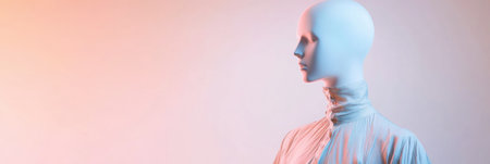 A stylish mannequin dressed in a modern outfit stands against a soft pastel background, illuminated by clean lighting with blank space for text.