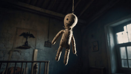 A voodoo doll hanging in a haunted house